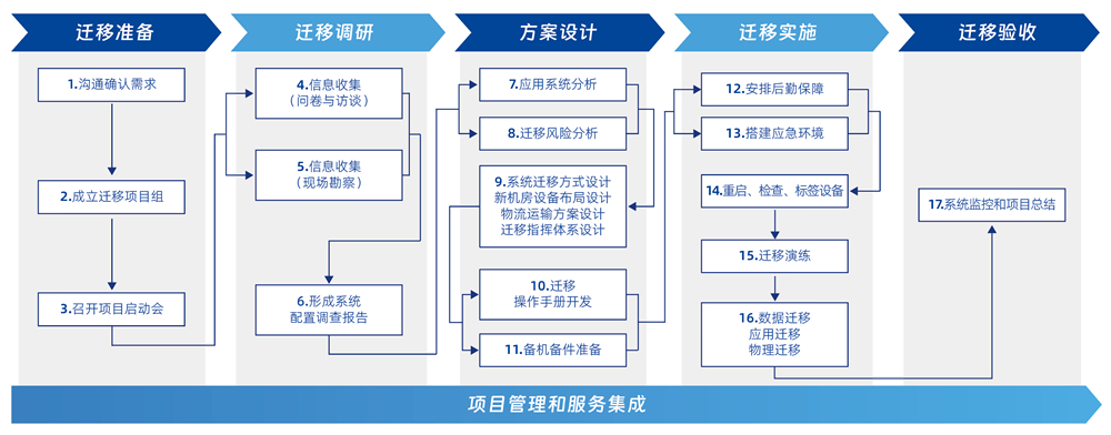 帮助客户进行数据中心的各类迁移服务,,,,包括传统数据中心及新一代云数据中心的 IT 基础设施设备迁移、、、、系统迁移、、数据迁移、、、应用迁移、、同城灾备/双活、、、异地容灾等各类场景迁移。。设备包含主机、、存储、、网络、、、服务器、、、云平台、、、数据库、、、、中间件、、、应用、、、、灾备系统等各类软硬件。。。。迁移服务通过制定迁移策略和计划,,,,组织高效、、、、准确地执行迁移,,,并在既定等停机窗口内完成数据中心的搬、、迁、、、、建、、管、、、、谋等过程。。。。 一站式集成迁移服务能力:新一代数据中心规划、、、建设、、、、优化、、、、容灾、、、迁移、、物流、、备件、、运维