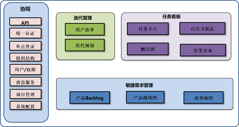 • 协同管理部分(包括平台的API,,,认证管理,,,组织结构,,,权限管理以及系统的配置);